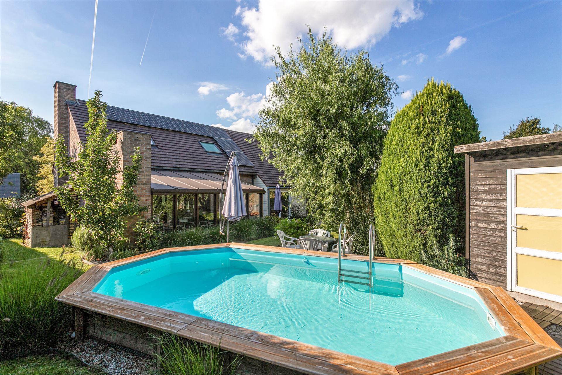 VENDU ! Idéalement située (écoles maternelle et primaire à proximité, à 5′ du centre de Chastre avec sa gare et ses commerces et à 8 minutes du centre de Gembloux), Gilmont Immobilier a le plaisir de vous présenter cette agréable villa de 1991 agrandie en 1998 sur 8 ares, qui a été bichonnée par ses propriétaires. Elle offre une superficie habitable de +/- 170 m² comprenant au rez : un hall d’entrée avec wc, un agréable living avec un poêle biomasse donnant accès à une véranda et son coin barbecue , une cuisine équipée américaine (cuisinière semi-pro au gaz, four élec, hotte, LV, évier et emplacement frigo)+ arrière cuisine, bureau, buanderie et 2ème wc . Au 1er étage : un hall de nuit , 3 chambres et salle de bains. Grand garage 1 voiture avec à l’étage un atelier de +/- 27 m². Une piscine chauffée et 13 panneaux photovoltaïques viennent compléter cette très belle offre. PEB D – 317 kwh/m²/an – CU n° 20230915013345. Disponible le 15/03/2024. Faire offre à partir de 425.000 € sous réserve d’acceptation par les propriétaires. A visiter sans tarder !