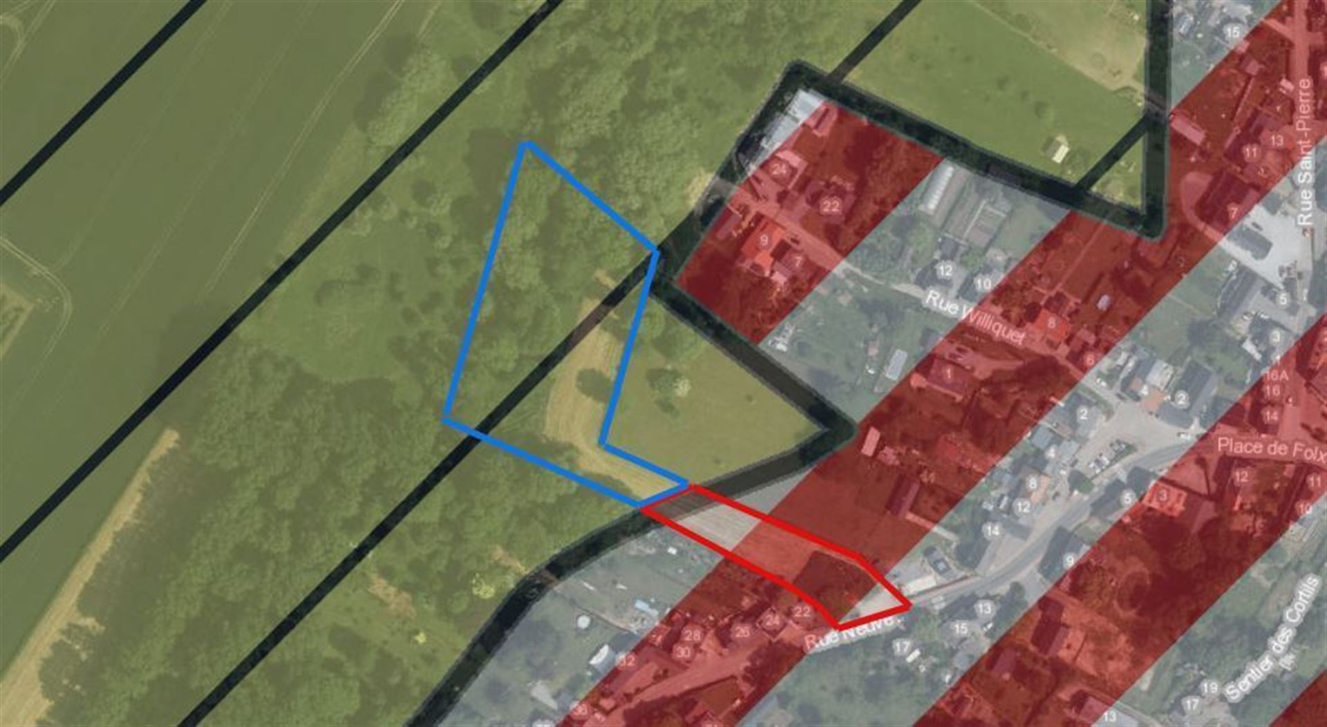 Grand terrain de 79,61 ares ! Cette parcelle située dans une rue calme de Folx-les-Cave vous offrira le calme en plus d’une magnifique vue !Largeur du terrain à rue d’environ 22m, largeur en fond de terrain d’environ 100m, profondeur de 183m. Zone constructible de 17 ares 62 et reste en zone agricole, parfait donc si vous rechercher un grand espace extérieur pour vos animaux ou pour votre tranquillité. Pas encore de retour de la commune concernant les possibilités de construction.