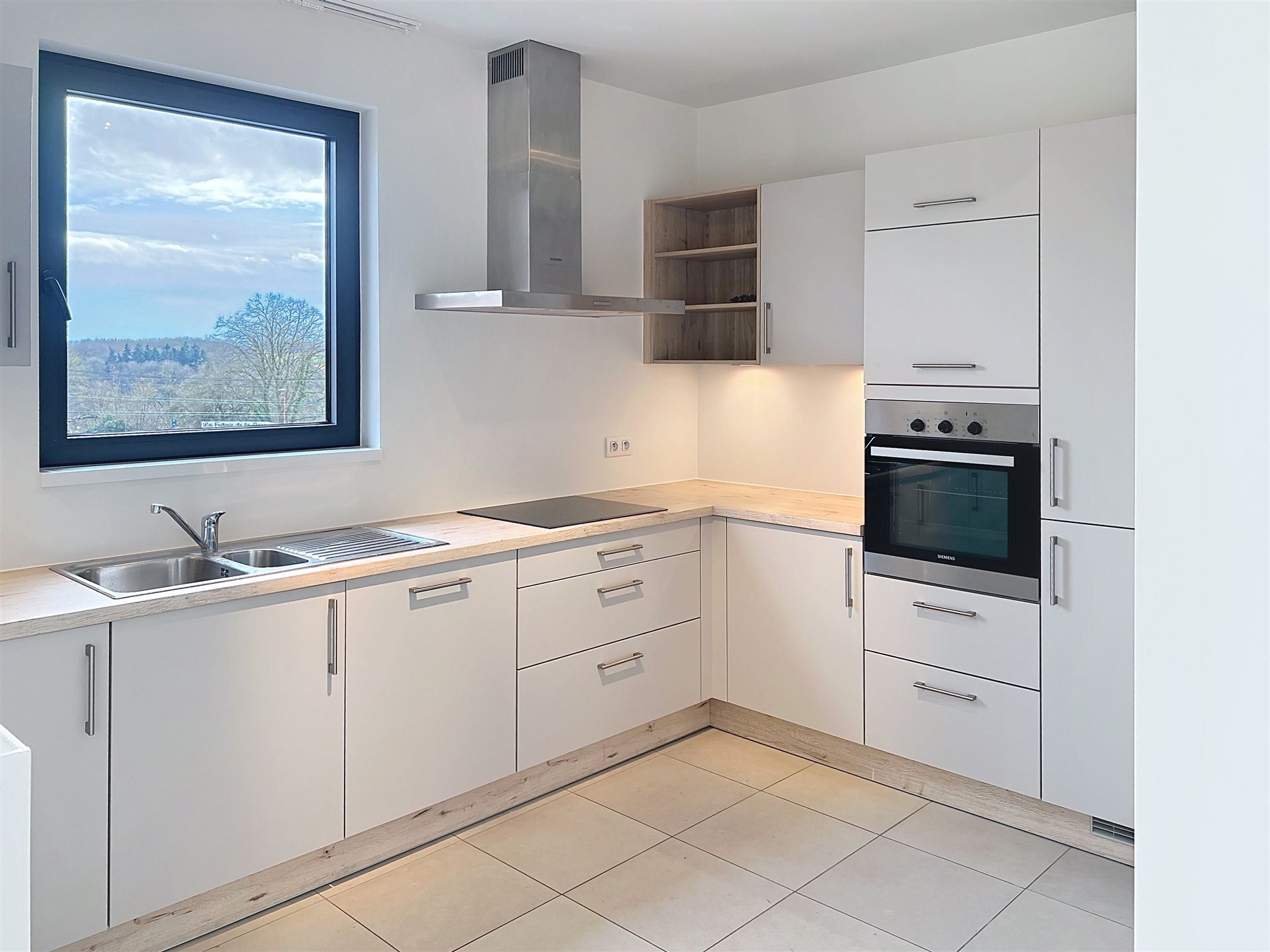La cuisine entièrement équipée, à la fois moderne et fonctionnelle, est complétée par un espace buanderie séparé, pratique pour le quotidien.